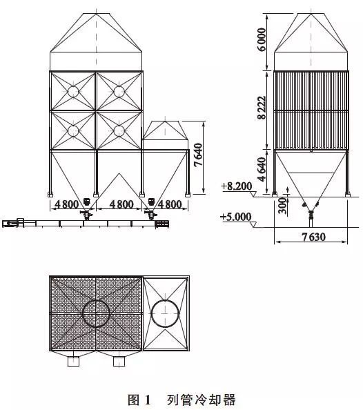 技術參數:處理風量380000m3/h;冷卻面積3600m2;冷卻風管數912根(Φ159mm×5~8m);進口氣體溫度400℃;出口氣體溫度180℃;風機4臺,SDF№11.2,18.5kW(風量60000m3/h,全壓686Pa)。