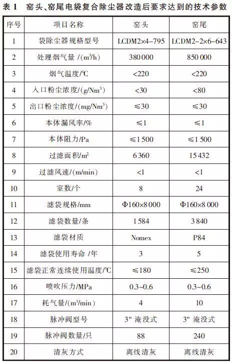 窯頭、窯尾電袋復合除塵器改造后要求達到的技術參數見表1。