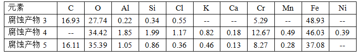 對級線上的腐蝕產物進行能譜分析,分析位置和結果如圖3和表2所示。能譜分析結果表明,氧化腐蝕層中存在氧、氯等氧化腐蝕性元素。