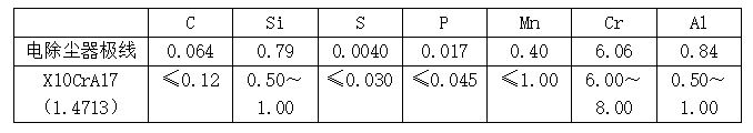 電除塵器極線的化學成分分析結果表明,該極線的成分符合德國DIN標準對耐熱鋼X10CrAl7的要求(見表1)。