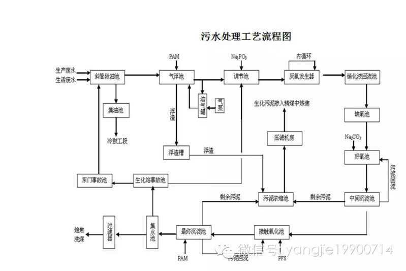 在洗苯、脫苯的操作過(guò)程中,循環(huán)洗油的質(zhì)量逐漸惡化,為保證洗油質(zhì)量,采用洗油再生器將部分洗油再生。 污廢水處理工藝流程:(A2/O2)