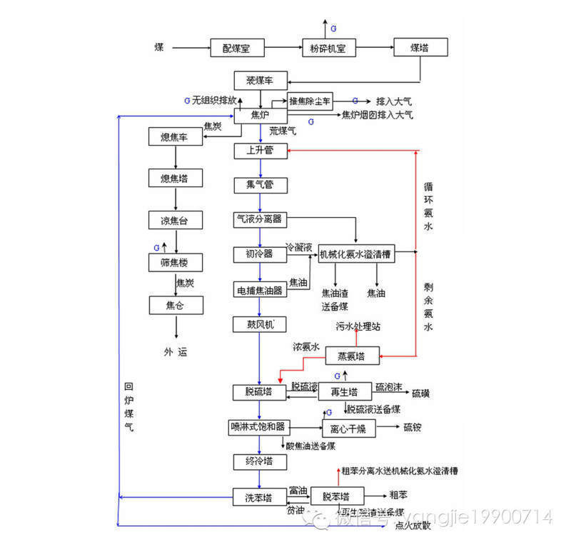 焦?fàn)t加熱燃用的凈化煤氣經(jīng)預(yù)熱器預(yù)熱至45℃左右進(jìn)入地下室,通過(guò)下噴管把煤氣送入燃燒室立火道,燃燒后的廢氣經(jīng)煙道、煙囪排入大氣。