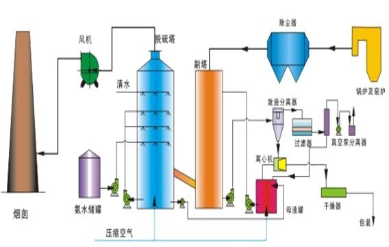 氨是一種良好的堿性吸收劑。利用氨的這一特性,以水溶液中的NH3和SO2反應為基礎用氨水將廢氣中的SO2脫除,生成亞硫酸氫銨和亞硫酸銨溶液,經氧化后得到硫酸銨溶液,進而干燥得到硫胺產品。